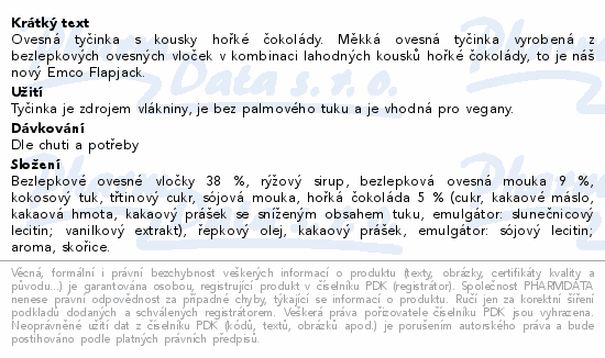 Ovesná tyčinka s kousky hořké čokolády. Měkká ovesná tyčinka vyrobená z bezlepkových ovesných vloček v kombinaci lahodných kousků hořké čokolády, to je náš nový Emco Flapjack.