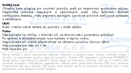 Chladivý krém přispívá pro uvolnění pokožky svalů po intenzivním sportovním výkonu. Napomáhá pokožce unavených a namožených svalů. Díky funkčním složkám osvěžujícího mentolu, máty peprné a eukalyptu vyvolá na pokožce svalů pocit zchlazení a revitalizace.