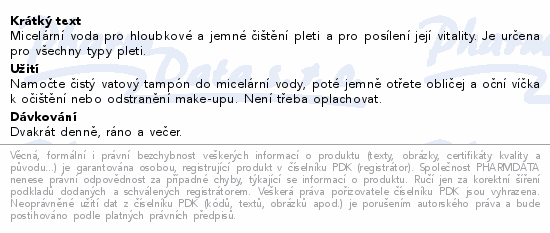 Micelární voda pro hloubkové a jemné čištění pleti a pro posílení její vitality. Je určena pro všechny typy pleti.