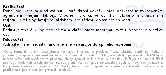 Denní oční kontura proti stárnutí, která chrání pokožku před poškozením způsobeným agresivními vnějšími faktory. Vhodné i pro citlivé oči. Formulováno s přísadami s rozjasňujícími a vyhlazujícími aktivitami pro zářivou oblast očních kontur.