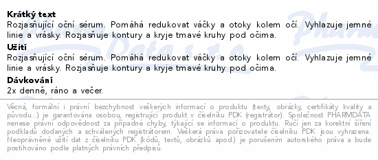 Rozjasňující oční sérum. Pomáhá redukovat váčky a otoky kolem očí. Vyhlazuje jemné linie a vrásky. Rozjasňuje kontury a kryje tmavé kruhy pod očima.