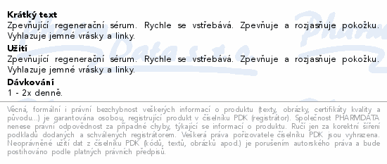 Zpevňující regenerační sérum. Rychle se vstřebává. Zpevňuje a rozjasňuje pokožku. Vyhlazuje jemné vrásky a linky.