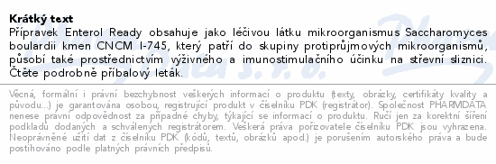 Přípravek Enterol Ready obsahuje jako léčivou látku mikroorganismus Saccharomyces boulardii kmen CNCM I-745, který patří do skupiny protiprůjmových mikroorganismů, působí také prostřednictvím výživného a imunostimulačního účinku na střevní sliznici. Čtěte pozorně příbalový leták.