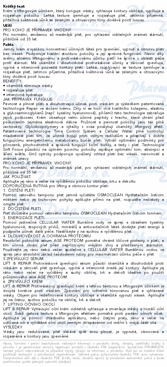 Krém s liftingovým účinkem, který koriguje vrásky, vyhlazuje kontury obličeje, vyplňuje a rozjasňuje pokožku. Lehká textura zjemňuje a rozjasňuje pleť, zatímco příjemná, přitažlivá květinová vůně se zelenými a citrusovými tóny dodává pocit luxusu.