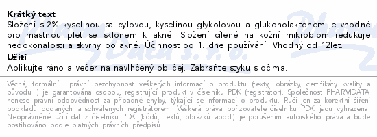 Složení s 2% kyselinou salicylovou, kyselinou glykolovou a glukonolaktonem je vhodné pro mastnou pleť se sklonem k akné. Složení cílené na kožní mikrobiom redukuje nedokonalosti a skvrny po akné. Účinnost od 1. dne používání. Vhodný od 12let.