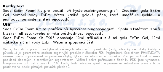 Sada ExEm Foam Kit pro použití při hysterosalpingosonografii. Zředěním gelu ExEm Gel pomocí vody ExEm Water vzniká gelová pěna, která umožňuje rychlou a jednoduchou distenzi stěn vejcovodů.
