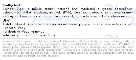 Exufiber Ag+ je měkké sterilní netkané krytí vyrobené z vysoce absorpčních, gelotvorných vláken z polyvinylalkoholu (PVA), která jsou z obou stran pokryta síranem stříbrným. Účinně absorbuje a zadržuje exsudát, čímž uchovává vlhké prostředí rány.