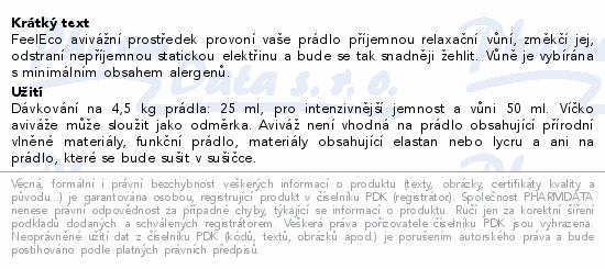 FeelEco avivážní prostředek provoní vaše prádlo příjemnou relaxační vůní, změkčí jej, odstraní nepříjemnou statickou elektřinu a bude se tak snadněji žehlit. Vůně je vybírána s minimálním obsahem alergenů.