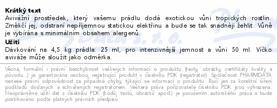 Avivážní prostředek, který vašemu prádlu dodá exotickou vůni tropických rostlin. Změkčí jej, odstraní nepříjemnou statickou elektřinu a bude se tak snadněji žehlit. Vůně je vybírána s minimálním obsahem alergenů.