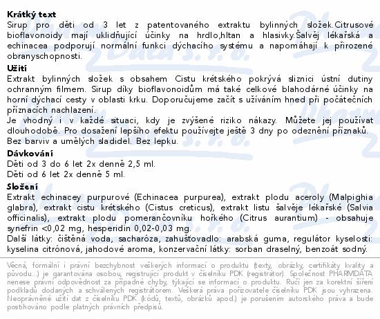 Sirup pro děti od 3 let z patentovaného extraktu bylinných složek.Citrusové bioflavonoidy mají uklidňující účinky na hrdlo, hltan a hlasivky.Šalvěj lékařská a echinacea podporují normální funkci dýchacího systému a napomáhají k přirozené obranyschopnosti.