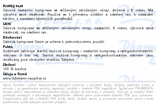 Gázová nesterilní komprese se střiženými založenými okraji, složená z 8 vrstev. Má výborné savé vlastnosti. Používá se k přímému očištění a ošetření ran, k odsávání tekutin, k nanášení léčebných prostředků.