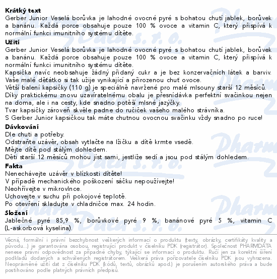 Gerber Junior Veselá borůvka je lahodné ovocné pyré s bohatou chutí jablek, borůvek a banánu. Každá porce obsahuje pouze 100 % ovoce a vitamin C, který přispívá k normální funkci imunitního systému dítěte.