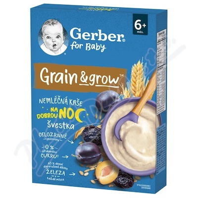 Gerber nemléčná kaše švestka je lahodný obilný příkrm pro vaše miminko. Kašička je vyrobena z pečlivě vybraných celozrnných obilovin, pšenice a ovsa. Bez přidaného cukru a aromat. Kaše je určena pro kojence od ukončeného 6. měsíce.