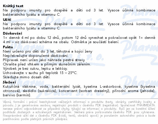 Na podporu imunity pro dospělé a děti od 3 let. Vysoce účinná kombinace bakteriálního lyzátu a vitaminu C.