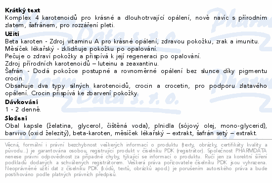 Komplex 4 karotenoidů pro krásné a dlouhotrvající opálení, nově navíc s přírodním zlatem, šafránem, pro rozzáření pleti.
