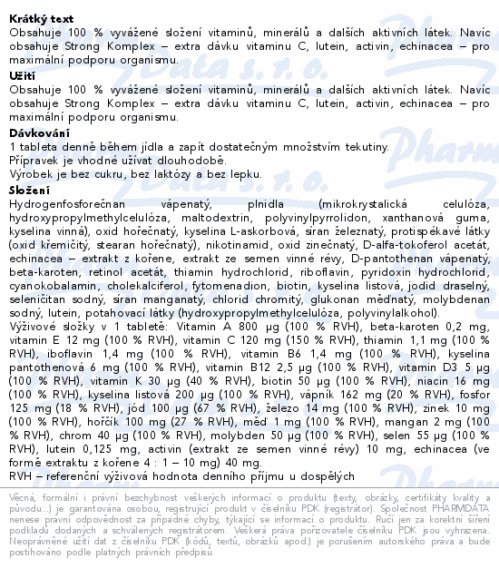 Obsahuje 100 % vyvážené složení vitaminů, minerálů a dalších aktivních látek. Navíc obsahuje Strong Komplex – extra dávku vitaminu C, lutein, activin, echinacea – pro maximální podporu organismu.