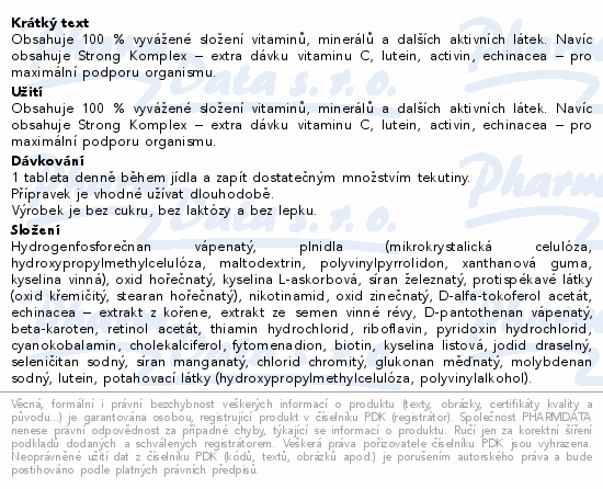 Obsahuje 100 % vyvážené složení vitaminů, minerálů a dalších aktivních látek. Navíc obsahuje Strong Komplex – extra dávku vitaminu C, lutein, activin, echinacea – pro maximální podporu organismu.