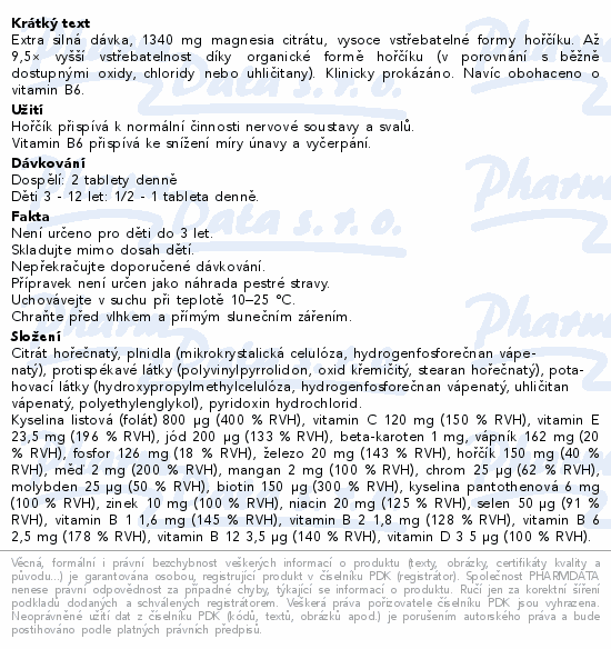 Extra silná dávka, 1340 mg magnesia citrátu, vysoce vstřebatelné formy hořčíku. Až 9, 5Ă— vyšší vstřebatelnost díky organické formě hořčíku (v porovnání s běžně dostupnými oxidy, chloridy nebo uhličitany). Klinicky prokázáno. Navíc obohaceno o vitamin B6.