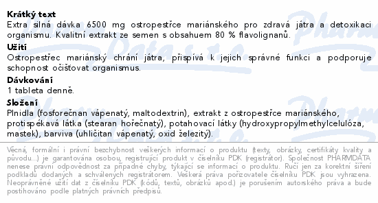 Extra silná dávka 6500 mg ostropestřce mariánského pro zdravá játra a detoxikaci organismu. Kvalitní extrakt ze semen s obsahuem 80 % flavolignanů.