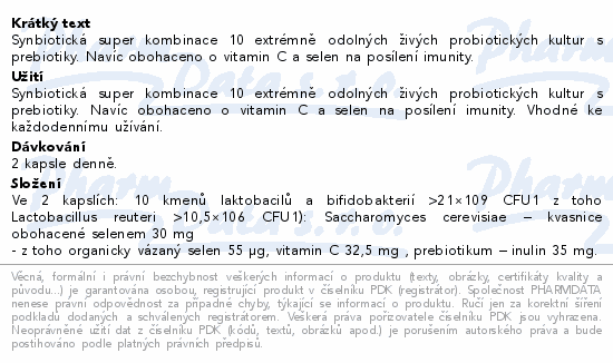 Synbiotická super kombinace 10 extrémně odolných živých probiotických kultur s prebiotiky. Navíc obohaceno o vitamin C a selen na posílení imunity.
