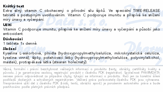 Extra silný vitamin C obohacený o přírodní sílu šípků. Ve speciální TIME-RELEASE tabletě s postupným uvolňováním. Vitamin C podporuje imunitu a přispívá ke snížení míry únavy a vyčerpání.