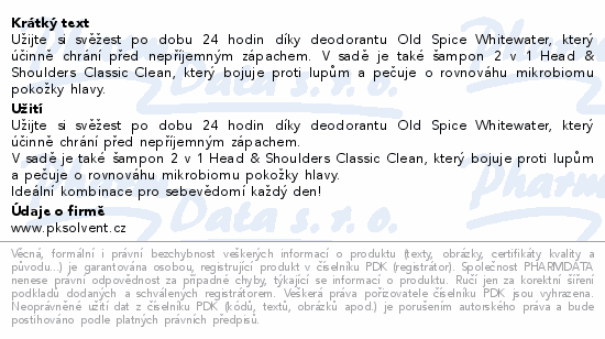 Užijte si svěžest po dobu 24 hodin díky deodorantu Old Spice Whitewater, který účinně chrání před nepříjemným zápachem. V sadě je také šampon 2 v 1 Head & Shoulders Classic Clean, který bojuje proti lupům a pečuje o rovnováhu mikrobiomu pokožky hlavy.