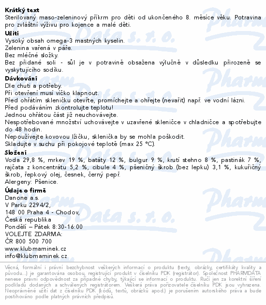 Sterilovaný maso-zeleninový příkrm pro děti od ukončeného 8. měsíce věku. Potravina pro zvláštní výživu pro kojence a malé děti.