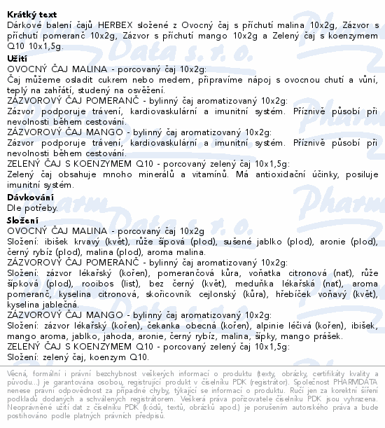 Dárkové balení čajů HERBEX složené z Ovocný čaj s příchutí malina 10x2g, Zázvor s příchutí pomeranč 10x2g, Zázvor s příchutí mango 10x2g a Zelený čaj s koenzymem Q10 10x1, 5g.