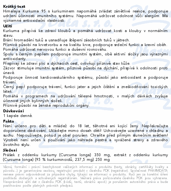 Himalaya Kurkuma 95 s kurkuminem napomáhá zvládat zánětlivé reakce, podporuje udržení účinnosti imunitního systému. Napomáhá udržovat odolnost vůči alergiím. Má významné antioxidační vlastnosti.