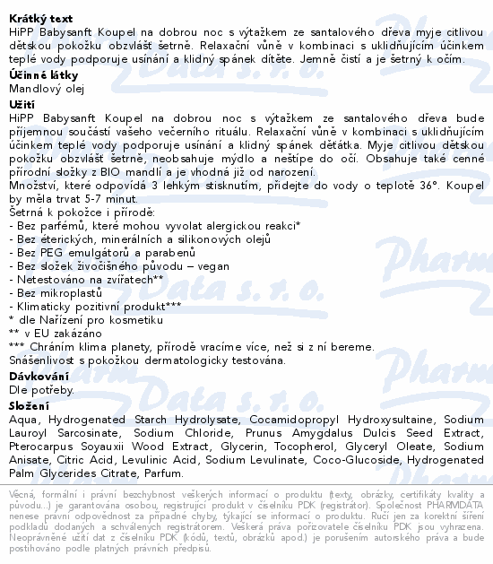 HiPP Babysanft Koupel na dobrou noc s výtažkem ze santalového dřeva myje citlivou dětskou pokožku obzvlášť šetrně. Relaxační vůně v kombinaci s uklidňujícím účinkem teplé vody podporuje usínání a klidný spánek dítěte. Jemně čistí a je šetrný k očím.