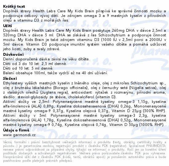 Doplněk stravy Health Labs Care My Kids Brain přispívá ke správné činnosti mozku a podporuje celkový vývoj dětí. Je zdrojem omega 3 a 9 mastných kyselin z přírodních olejů a vitaminu D3 z mořských řas.