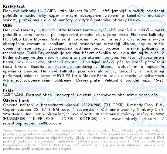 Plenkové kalhotky HUGGIES Little Movers PANTS - ještě jemnější a měkčí; celodenní pohodlí a sucho díky super měkkým absorpčním vrstvám a kanálkům; indikátor vlhkosti; pružný pas a dvojité manžety; prodyšné materiály; obrázky Disney.