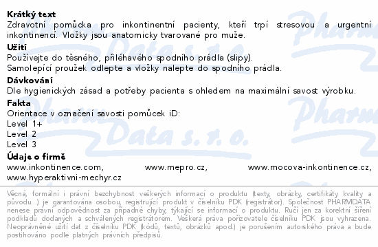 Zdravotní pomůcka pro inkontinentní pacienty, kteří trpí stresovou a urgentní inkontinencí. Vložky jsou anatomicky tvarované pro muže.