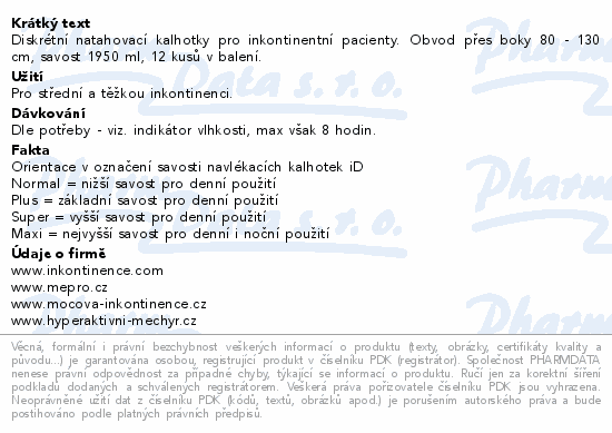 Diskrétní natahovací kalhotky pro inkontinentní pacienty. Obvod přes boky 80 - 130 cm, savost 1950 ml, 12 kusů v balení.