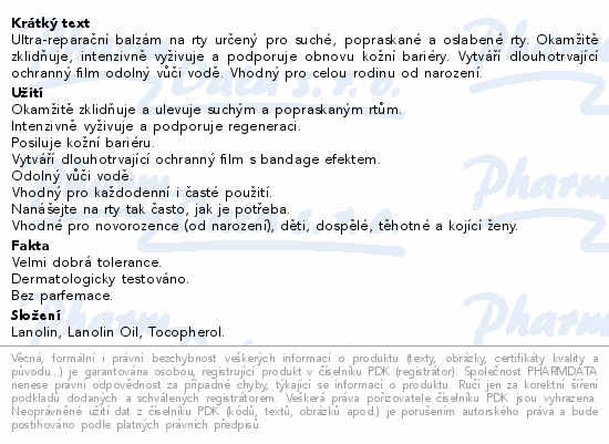 Ultra-reparační balzám na rty určený pro suché, popraskané a oslabené rty. Okamžitě zklidňuje, intenzivně vyživuje a podporuje obnovu kožní bariéry. Vytváří dlouhotrvající ochranný film odolný vůči vodě. Vhodný pro celou rodinu od narození.