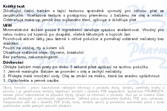 Zklidňující čistící balzám s tající texturou speciálně vyvinutý pro citlivou pleť se zarudnutím. Vícefázová textura s postupnou přeměnou z balzámu na olej a mléko. Odstraňuje make-up jemně bez zvýšeného tření, vyživuje a zklidňuje pleť.