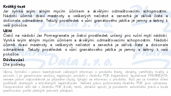 Jar vyniká svým silným mycím účinkem a skvělými odmašťovacími schopnostmi. Nádobí účinně zbaví mastnoty a veškerých nečistot a zanechá je zářivě čisté a dokonale odmaštěné. Tekutý prostředek s vůní granátového jablka je jemný a šetrný k vaší pokožce.