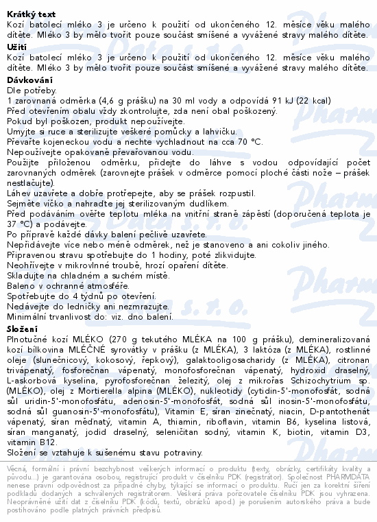 Kozí batolecí mléko 3 je určeno k použití od ukončeného 12. měsíce věku malého dítěte. Mléko 3 by mělo tvořit pouze součást smíšené a vyvážené stravy malého dítěte.