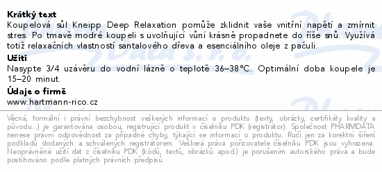 Koupelová sůl Kneipp Deep Relaxation pomůže zklidnit vaše vnitřní napětí a zmírnit stres. Po tmavě modré koupeli s uvolňující vůní krásně propadnete do říše snů. Využívá totiž relaxačních vlastností santalového dřeva a esenciálního oleje z pačuli.