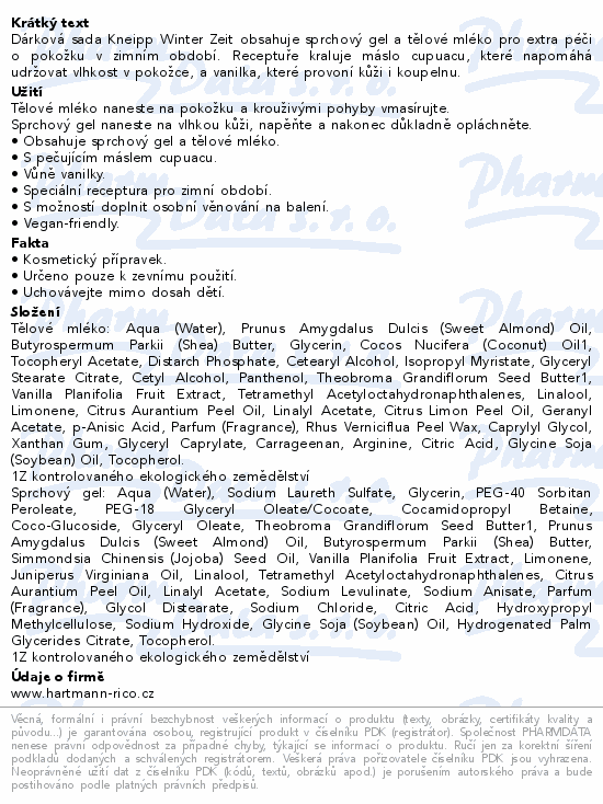 Dárková sada Kneipp Winter Zeit obsahuje sprchový gel a tělové mléko pro extra péči o pokožku v zimním období. Receptuře kraluje máslo cupuacu, které napomáhá udržovat vlhkost v pokožce, a vanilka, které provoní kůži i koupelnu.