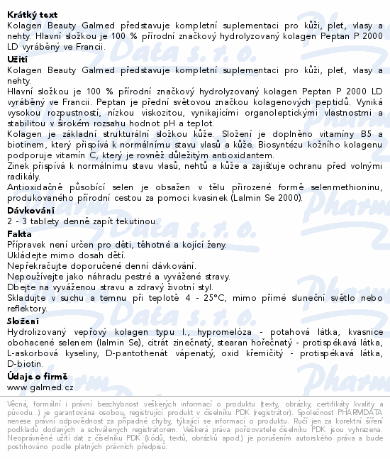 Kolagen Beauty Galmed představuje kompletní suplementaci pro kůži, pleť, vlasy a nehty. Hlavní složkou je 100 % přírodní značkový hydrolyzovaný kolagen Peptan P 2000 LD vyráběný ve Francii.