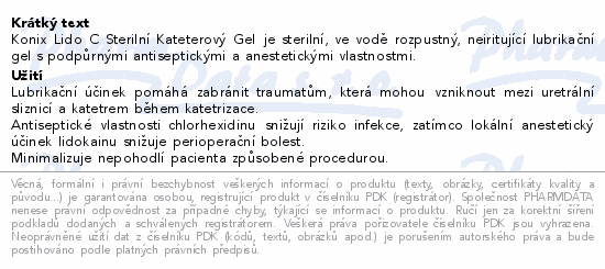 Konix Lido C Sterilní Kateterový Gel je sterilní, ve vodě rozpustný, neiritující lubrikační gel s podpůrnými antiseptickými a anestetickými vlastnostmi.