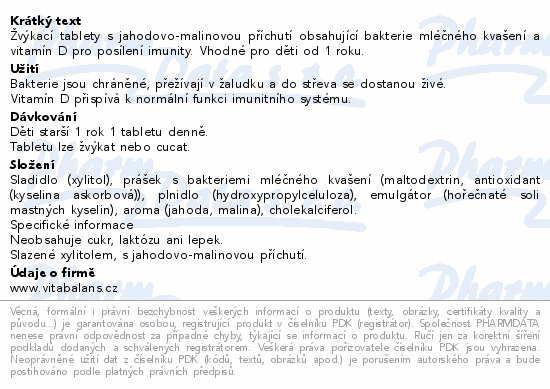 Žvýkací tablety s jahodovo-malinovou příchutí obsahující bakterie mléčného kvašení a vitamín D pro posílení imunity. Vhodné pro děti od 1 roku.