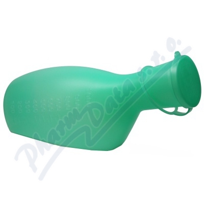 Zelená láhev na moč s uzávěrem v PE sáčku - plastová láhev o objemu 1000ml s dělenou stupnicí po 50ml, opatřená zeleným uzávěrem. Je určena zejména špatně pohyblivým nebo nepohyblivým pacientům (mužům), k zachycení jednotlivých porcí moči.