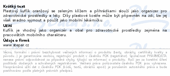 Plastový kufřík oranžový se zeleným křížem a přihrádkami slouží jako organizer pro zdravotnické prostředky a léky. Díky plastové kostře může být připevněn na zdi, lze jej však snadno vyjmout a použít jako mobilní lékárničku.