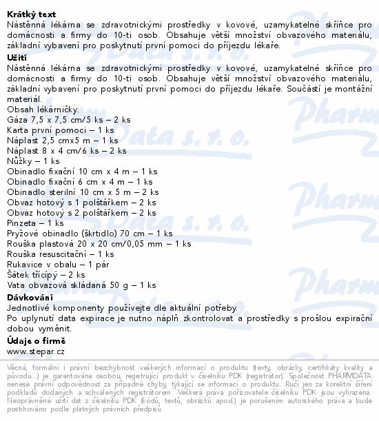 Nástěnná lékárna se zdravotnickými prostředky v kovové, uzamykatelné skříňce pro domácnosti a firmy do 10-ti osob. Obsahuje větší množství obvazového materiálu, základní vybavení pro poskytnutí první pomoci do příjezdu lékaře.