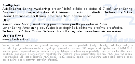 Aviváž Lenor Spring Awakening provoní ložní prádlo po dobu až 7 dní. Lenor Spring Awakening používejte jako doplněk k běžnému pracímu prostředku. Technologie Active Odour Defense chrání tkaniny před zápachem během nošení.