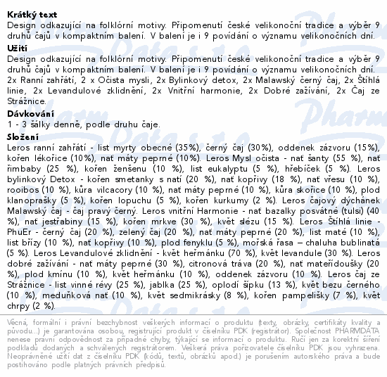 Design odkazující na folklórní motivy. Připomenutí české velikonoční tradice a výběr 9 druhů čajů v kompaktním balení. V balení je i 9 povídání o významu velikonočních dní.