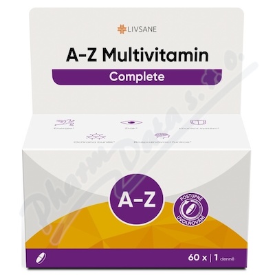 LIVSANE A-Z Multivitamin Complete je doplněk stravy s vitaminy, minerály, stopovými prvky a luteinem ve formě tablet s postupným uvolňováním. Bez laktózy.