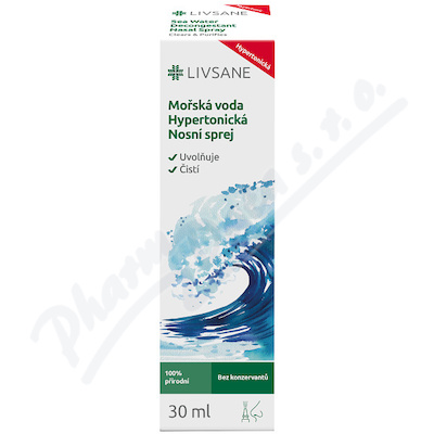 LIVSANE Mořská voda sprej 30ml pro intenzivní čištění a proplachování nosu a pro zvlhčování nosní sliznice. Vhodný pro každodenní čištění ucpaného nosu a nosních dutin např. od bakterií, pylu nebo prachu. Ideální během období nachlazení a alergií.